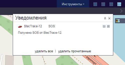 При нажатии на StecTrace кнопки SOS в окне мониторинга отобразится уведомление во всплывающем окне: